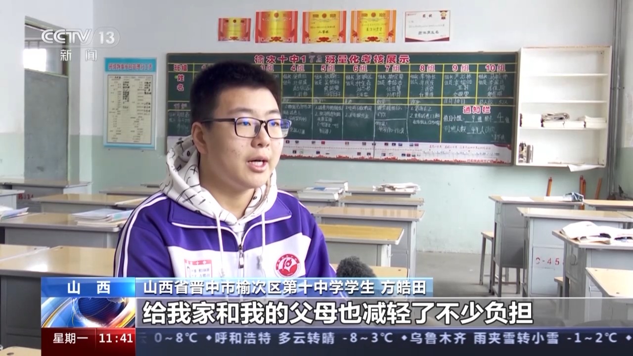 山西省晉中市榆次區(qū)第十中學(xué)學(xué)生 方皓田:學(xué)校為我們每個學(xué)生都上了校方責(zé)任險,算下來醫(yī)療費除醫(yī)保報銷部分以外,剩余的12000多元都給我報銷了,給我家和我的父母也減輕了不少負(fù)擔(dān)。