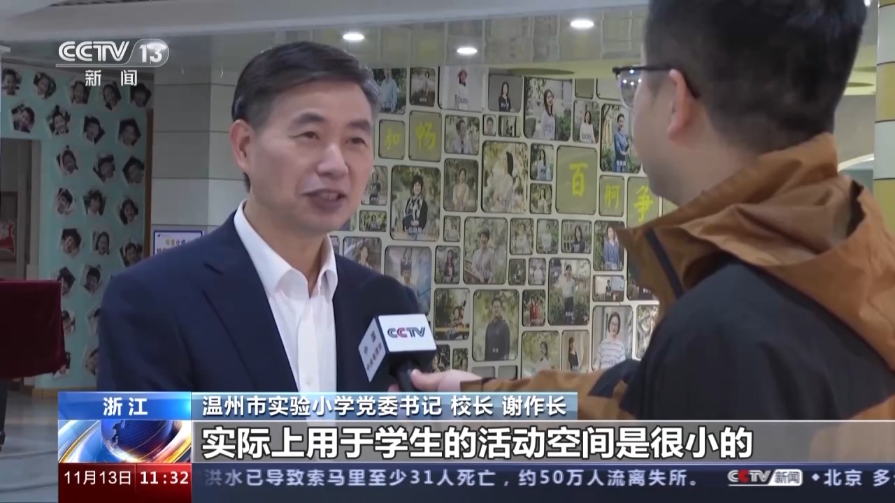 溫州市實驗小學(xué)黨委書記、校長 謝作長:這個6.6平方米,聽起來好像并不小,但它包含了會議室、食堂、教師辦公室等等功能房,實際上用于學(xué)生的活動空間是很少的,你看它只有省標(biāo)的三分之一左右呀。但是再怎么困難,課間十分鐘是必須讓孩子們放松。