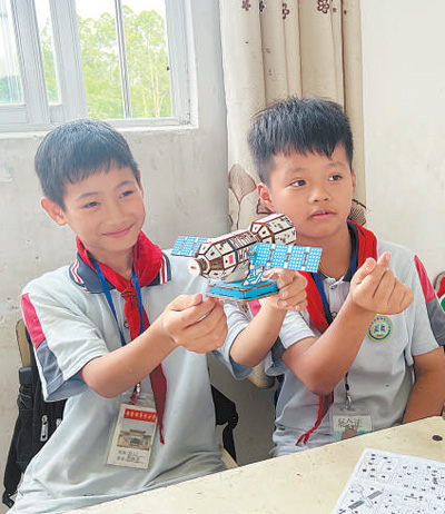 “這是航天衛(wèi)星的兩翼,是安裝太陽(yáng)能電池板的地方?!眮?lái)自廣西壯族自治區(qū)梧州市藤縣第五小學(xué)的三年級(jí)學(xué)生李杰峰驕傲地展示著親手組裝的模型,他希望將來(lái)能從事航天工作。