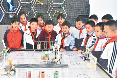 4月8日,浙江省建德市明珠小學(xué)勵(lì)珠機(jī)器人社團(tuán)的學(xué)生在科學(xué)老師指導(dǎo)下,正在體驗(yàn)操作“九宮機(jī)器人”。寧文武攝(人民視覺)
