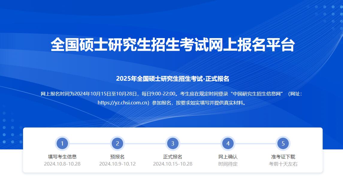 網(wǎng)上報(bào)名時(shí)間為2024年10月15日至10月28日(網(wǎng)上預(yù)報(bào)名時(shí)間為2024年10月9日至10月12日,相關(guān)工作安排由各省級(jí)教育招生考試機(jī)構(gòu)確定并公布),每日9:00-22:00??忌鷳?yīng)在規(guī)定時(shí)間登錄“中國(guó)研究生招生信息網(wǎng)”(網(wǎng)址:https://yz.chsi.com.cn)參加報(bào)名,按要求如實(shí)填寫(xiě)并提供真實(shí)材料。