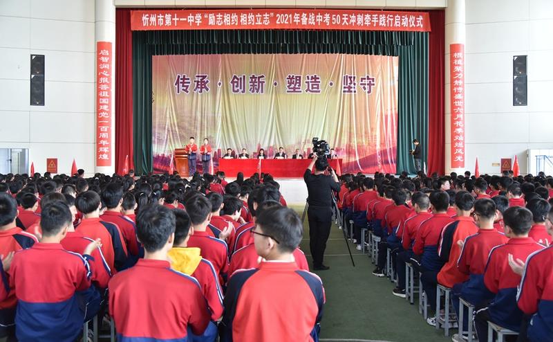 又是一年五月,陽光明媚,又逢“五四”,血脈僨張。在五月的花海中擁抱青春的時代,在初升的太陽下點燃生命的未來。為進一步激發(fā)初三師生堅定目標、奮力拼搏、沖刺中考的雄心壯志,5月4日上午,忻州市第十一中學初三年級全體師生在學校文體藝苑舉行了“勵志相約、相約立志”2021屆備戰(zhàn)中考50天沖刺牽手踐行啟動儀式,校長張云長、黨支部書記趙智剛、學校領(lǐng)導、部分家長代表共同見證了這一振奮人心的時刻。