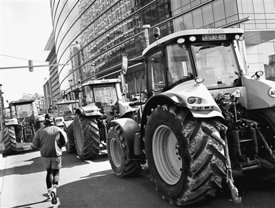 歐盟與俄羅斯之間的相互制裁導致歐盟成員國農產品價格下跌,引發(fā)農民不滿。圖為今年3月,比利時農民將拖拉機開上布魯塞爾的街道,進行抗議示威。人民視覺