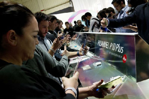 2月26日,在西班牙巴塞羅那舉行的世界移動通信大會開幕前,人們試用中國品牌華為新發(fā)布的P10和P10 Plus手機(jī)。(新華社)