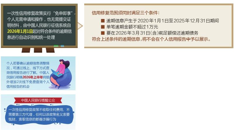 在進行必要的技術(shù)準備后,中國人民銀行于22日明確發(fā)布一次性信用修復政策有關(guān)安排。自2026年1月1日起征信中心將根據(jù)不同還款情形完成自動調(diào)整,相關(guān)逾期記錄不再在個人信用報告中展示。