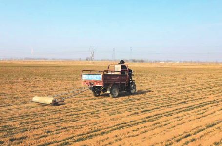 管護(hù)工人熟練地操作著磙子將麥田壓實