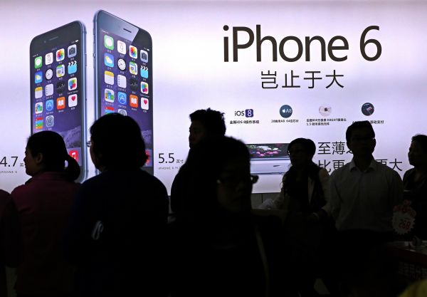 2014年10月17日,顧客在江西南昌的一家蘋果授權(quán)經(jīng)銷店門口排隊(duì),等待購(gòu)買iPhone6和iPhone6 Plus手機(jī)。 (新華社發(fā))
