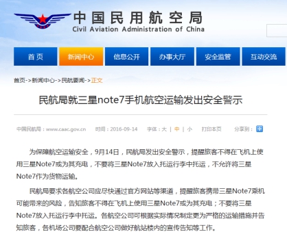受三星“炸機門”事件持續(xù)發(fā)酵的影響,為了保障乘客出行安全,中國各大航空公司對三星Note7紛紛下達了“封殺令”! 9月13日,中國首家航空公司-海南航空宣布禁止集團員工攜帶Note7登機、托運,并且也不接受旅客在飛機上使用和托運Note7。隨后,中國民航局要求各航空公司應盡快通過官方網(wǎng)站等渠道,提醒旅客攜帶Note7乘機可能帶來的風險。截至9月15日,中國國內(nèi)已有14家航空公司針對Note7出臺禁令。
