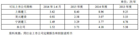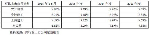 2013年至2016年6月,重慶建工實(shí)現(xiàn)毛利365,161.26萬元、345,832.10萬元、381,910.45萬元、141,170.84萬元。綜合毛利率略低于同行業(yè)可比上市公司的平均水平,重慶建工綜合毛利率分別為7.38%、7.89%、8.29%、6.62%。