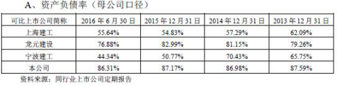 2013年至2016年6月,重慶建工資產(chǎn)負(fù)債率較高,分別為87.59%、86.98%、87.17%、86.31%,高于同行業(yè)上市公司。