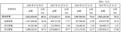 根據(jù)招股書,2013年至2016年6月,重慶建工負(fù)債合計(jì)5,110,662.36萬元、5,286,972.23萬元、5,647,761.37萬元、5,685,083.35萬元。其中,流動(dòng)負(fù)債為3,992,403.68萬元、3,987,952.54萬元、4,722,621.72萬元、5,021,929.56萬元,占負(fù)債總額的78.12%、75.43%、83.62%、88.34%;非流動(dòng)負(fù)債1,118,258.68萬元、1,299,019.6萬元、925,139.64萬元、663,153.80萬元,占負(fù)債總額的21.88%、24.57%、16.38%、11.66%。
