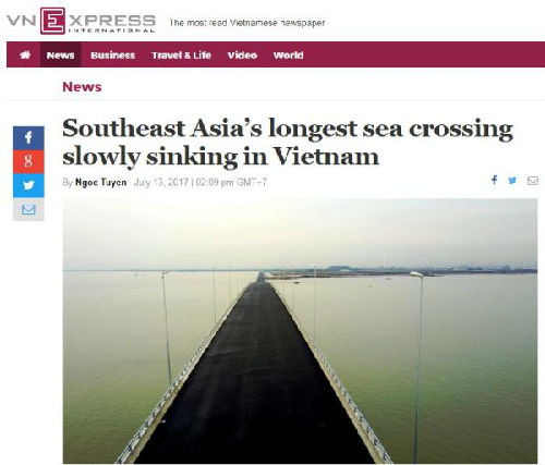 這座橋號稱是東南亞最長的跨海大橋,路線全長約15公里,是日本援助了10萬億越盾(約合人民幣30億元)修建的。不過現(xiàn)在,工程尚未完全竣工,但越南媒體報道稱,這座橋好像看上去正在“緩緩下沉”。