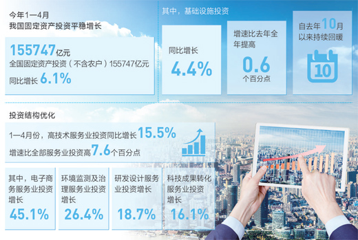 打開今年頭4個月的投資“成績單”,延續(xù)了增長平穩(wěn)的態(tài)勢。今年前4月,全國固定資產(chǎn)投資同比增長6.1%,增速比去年全年加快0.2個百分點(diǎn)。