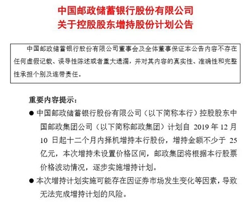 備受市場(chǎng)關(guān)注的是,同日,郵儲(chǔ)銀行還發(fā)布了《關(guān)于控股股東增持股份計(jì)劃公告》。公告稱,控股股東中國(guó)郵政集團(tuán)公司(下稱郵政集團(tuán))計(jì)劃自2019年12月10日起12個(gè)月內(nèi)擇機(jī)增持該行A股股份,增持金額不少于25億元。這體現(xiàn)了控股股東對(duì)郵儲(chǔ)銀行投資價(jià)值的高度認(rèn)可,也將為證券市場(chǎng)的穩(wěn)定運(yùn)行創(chuàng)造良好環(huán)境,彰顯“國(guó)家隊(duì)”擔(dān)當(dāng)。
