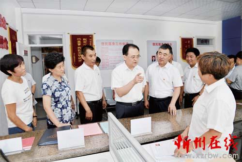 圖為省人大常委會(huì)副主任、市委書記李俊明在忻府區(qū)新建路辦事處和諧居委會(huì)調(diào)研創(chuàng)建全國(guó)文明城市情況。