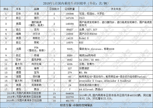 根據(jù)國家市場監(jiān)督管理總局缺陷產(chǎn)品管理中心1月份發(fā)布的召回公告,經(jīng)濟日報-中國經(jīng)濟網(wǎng)汽車頻道經(jīng)過匯總、統(tǒng)計,整理出“2019年1月國內(nèi)乘用車召回榜單”。1月,國內(nèi)乘用車市場發(fā)布19起召回公告,共涉及19個品牌的644636輛汽車,同比增長93.12%,環(huán)比增長33.81%。