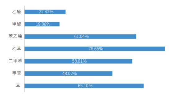 2022年度車內(nèi)空氣質(zhì)量測(cè)評(píng)結(jié)果顯示,常溫狀態(tài)下,除丙烯醛外,其余7種揮發(fā)性有機(jī)物均較2018-2021年有不同程度下降,一類致癌物甲醛和苯分別下降19.08%和65.10%,其余五種物質(zhì)也分別有22.42%至76.65%的下降。