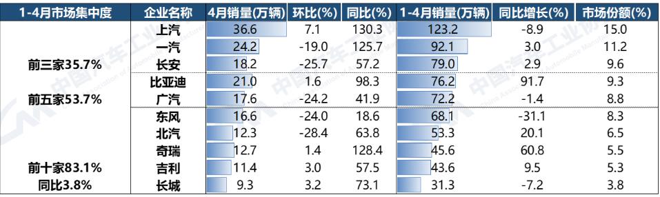 2023年1-4月,國內(nèi)汽車銷量排名前十位的企業(yè)集團(tuán)銷量合計為582.2萬輛,同比下降3.6%,較1-3月收窄12.7個百分點,占汽車銷售總量的84.8%,低于上年同期1.8個百分點。