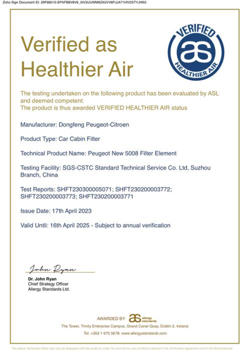 新5008斬獲ASL(Allergy Standards Limited)健康空氣認(rèn)證