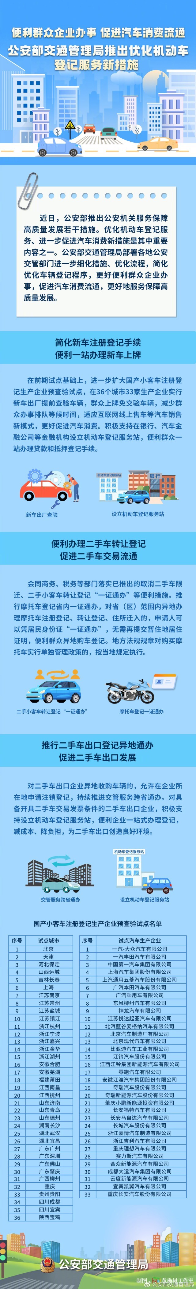 公安部交通管理局部署各地公安交管部門進(jìn)一步細(xì)化措施、優(yōu)化流程,簡化優(yōu)化車輛登記程序,更好便利群眾企業(yè)辦事,促進(jìn)汽車消費(fèi)流通,更好地服務(wù)保障高質(zhì)量發(fā)展。