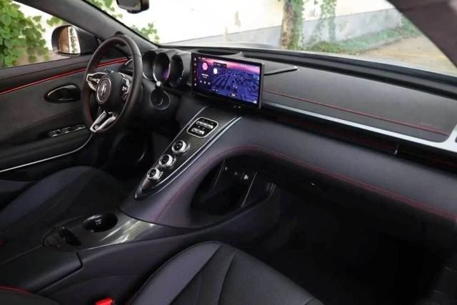 新車(chē)的內(nèi)飾通過(guò)大面積的黑色來(lái)與外觀(guān)相呼應(yīng),并且通過(guò)紅色的縫線(xiàn)進(jìn)行點(diǎn)綴,進(jìn)一步提升視覺(jué)效果。三圓形的儀表盤(pán)同樣有著較強(qiáng)的復(fù)古風(fēng),中間位置一塊懸浮式的中控大屏則將實(shí)用拉滿(mǎn)。