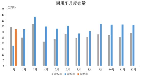 2024年1月,商用車產(chǎn)銷分別完成32.7萬輛和32.4萬輛,環(huán)比分別下降10.7%和11.1%,同比分別增長66.2%和79.6%。