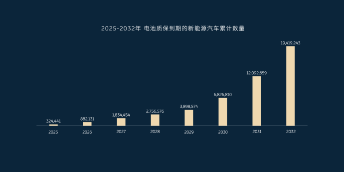 而此時(shí)距離2015年恰巧8年時(shí)間。蔚來汽車調(diào)查表示,2025到2032年,預(yù)計(jì)累計(jì)將有近2000萬輛新能源車面臨電池質(zhì)保到期,動(dòng)力電池將面臨脫保的行業(yè)問題。