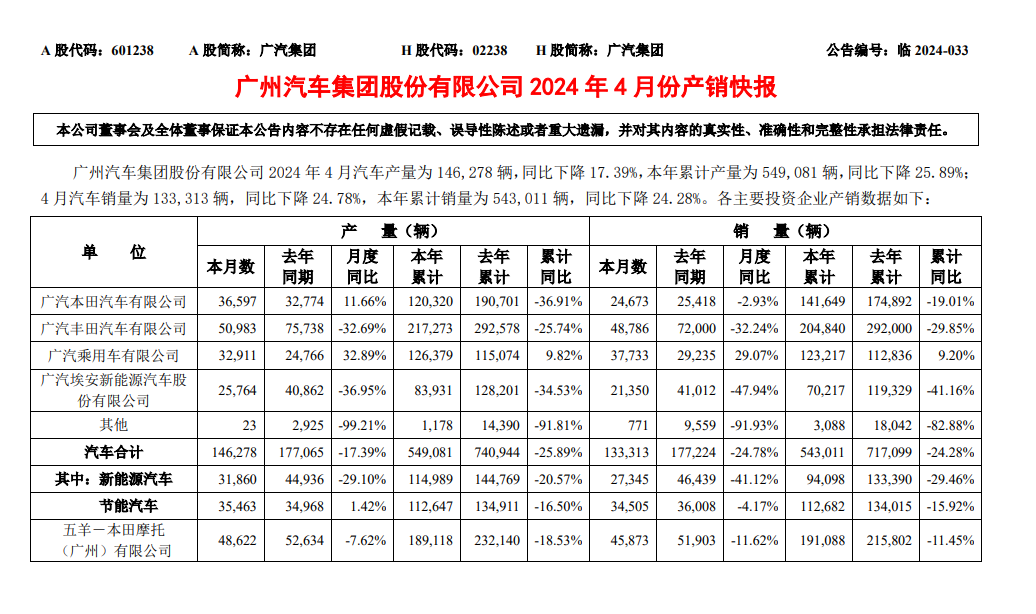 受廣汽豐田持續(xù)下滑影響,廣汽集團市場表現(xiàn)同樣糟糕。根據(jù)廣汽集團公布產(chǎn)銷量快報顯示,廣汽集團前4個月累計銷量為 543,011輛,同比下降 24.28%。