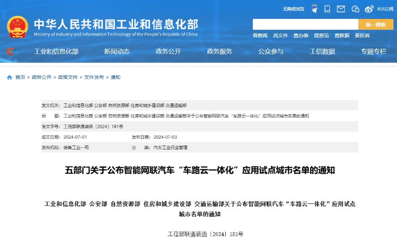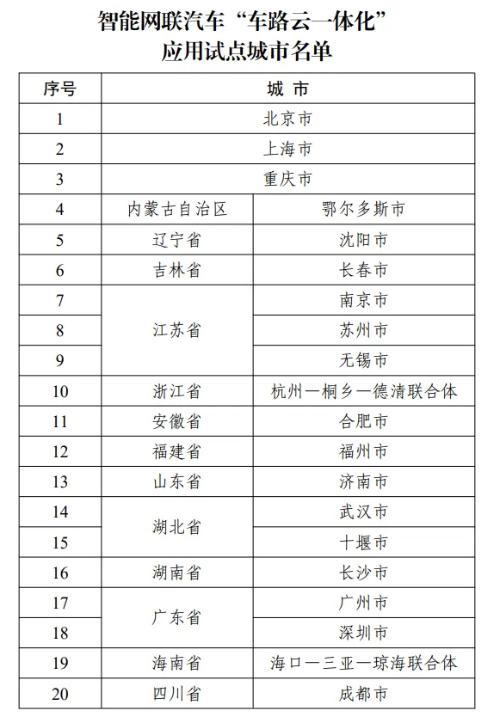 據(jù)工業(yè)和信息化部網(wǎng)站消息,近日,工業(yè)和信息化部、公安部、自然資源部、住房和城鄉(xiāng)建設部、交通運輸部等五部門聯(lián)合公布智能網(wǎng)聯(lián)汽車“車路云一體化”應用試點城市名單,20個城市(聯(lián)合體)榜上有名。