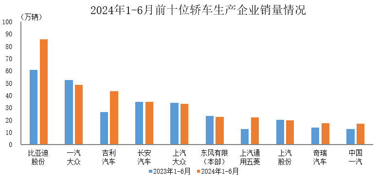 據(jù)中國汽車工業(yè)協(xié)會(huì)統(tǒng)計(jì)分析,2024年1-6月,銷量排名前十位的轎車生產(chǎn)企業(yè)共銷售345.7萬輛,占轎車銷售總量的67.8%。