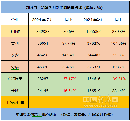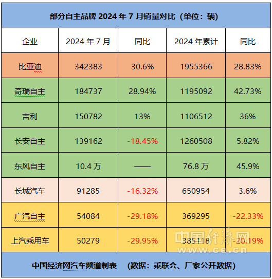 具體來(lái)看,7月,比亞迪、奇瑞自主、吉利、長(zhǎng)安自主和長(zhǎng)城的銷(xiāo)量分別為342383輛、184737輛、150782輛、139162輛、91285輛,同比分別增長(zhǎng)30.6%、28.94%、13%、-18.45%、-16.32%;前7個(gè)月的累計(jì)銷(xiāo)量分別為1955366輛、1195092輛、1106512輛、1260508輛、650954輛,同比分別增長(zhǎng)28.83%、42.73%、36%、5.82%、3.6%。