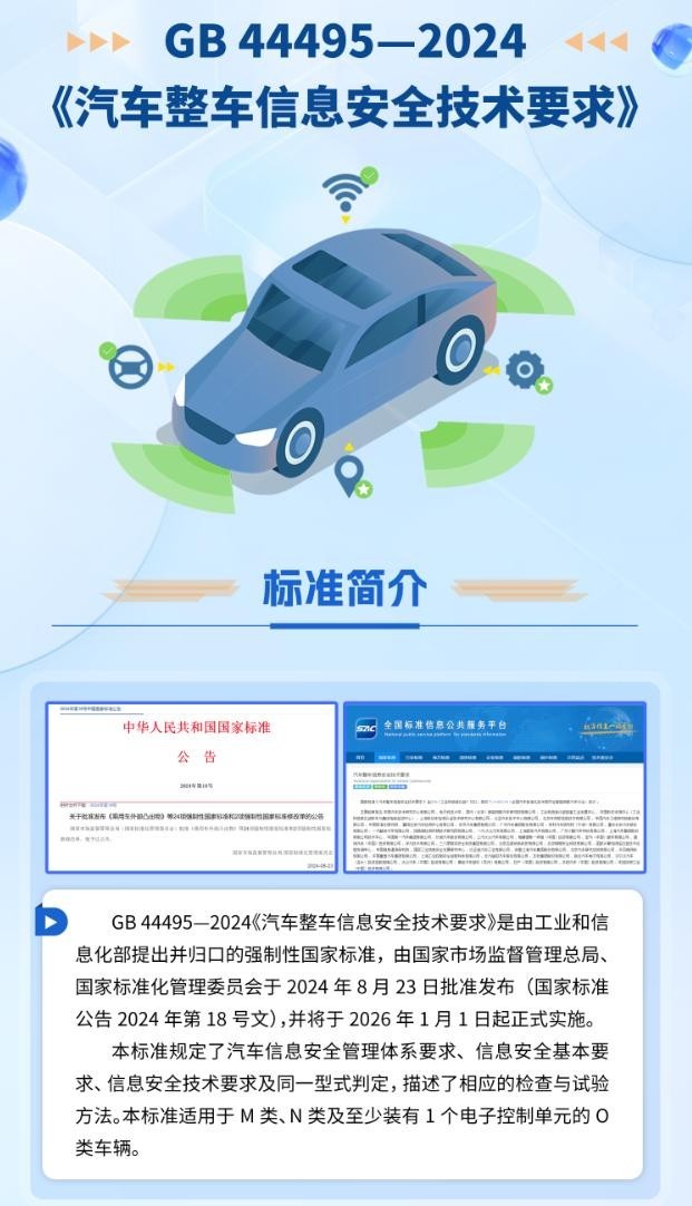 GB 44495—2024《汽車整車信息安全技術(shù)要求》規(guī)定了汽車信息安全管理體系要求,以及外部連接安全、通信安全、軟件升級(jí)安全、數(shù)據(jù)安全等方面的技術(shù)要求和試驗(yàn)方法,適用于M類、N類及至少裝有1個(gè)電子控制單元的O類車輛,對(duì)于提升我國(guó)汽車產(chǎn)品的信息安全防護(hù)技術(shù)水平、強(qiáng)化產(chǎn)業(yè)鏈風(fēng)險(xiǎn)防范和應(yīng)對(duì)網(wǎng)絡(luò)攻擊的能力、筑牢汽車信息安全防護(hù)基線具有重要意義。
