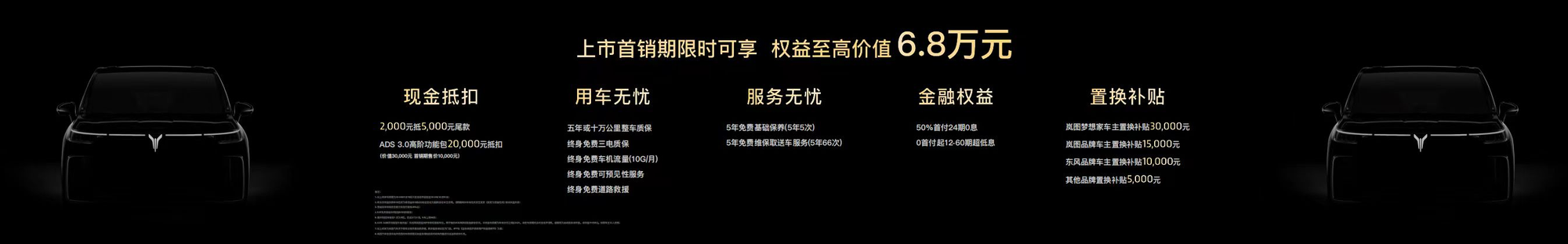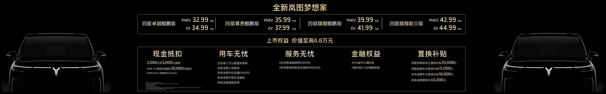 央廣網(wǎng)北京9月20日消息(記者 姜鵬)9月19日,以“感恩相伴 夢想同行”為主題的東風汽車感恩6000萬用戶相伴暨全新嵐圖夢想家上市發(fā)布會于武漢成功舉辦,全新嵐圖夢想家正式上市并公布價格,其中,全新嵐圖夢想家四驅(qū)卓越鯤鵬版PHEV 32.99萬元、EV 34.99萬元;全新嵐圖夢想家四驅(qū)尊貴鯤鵬版PHEV 35.99萬元、EV 37.99萬元;全新嵐圖夢想家四驅(qū)旗艦鯤鵬版PHEV 39.99萬元、EV 41.99萬元;全新嵐圖夢想家四驅(qū)旗艦乾崑版PHEV 42.99萬元、EV 44.99萬元。同時,截至10月10日,嵐圖還為用戶提供至高6.8萬元的首銷期專享權益,包含2千元抵5千元現(xiàn)金抵扣,原價3萬首銷期僅需1萬元的ADS3.0高階智駕包;此外還有用車無憂、服務無憂、0息金融等權益;針對換購的用戶還有至高3萬元的置換補貼。