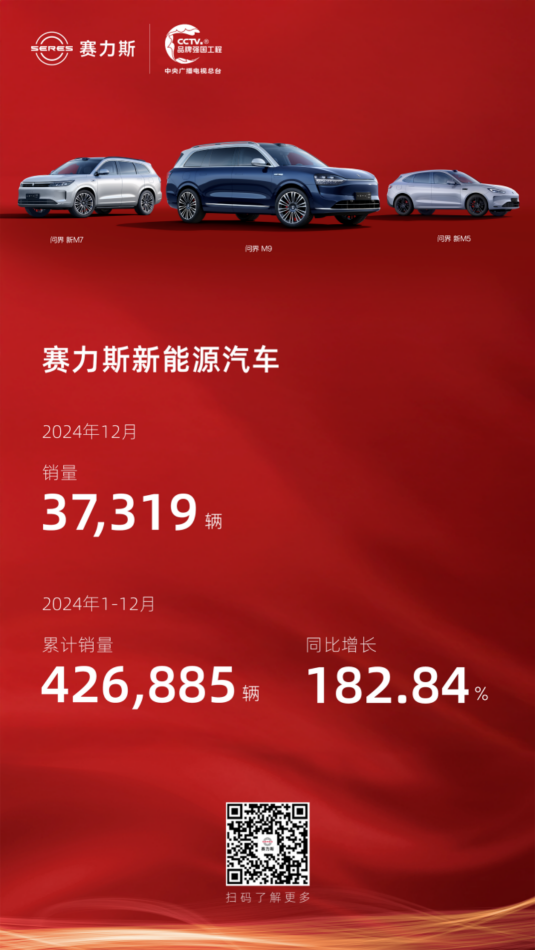 2025年1月1日,賽力斯發(fā)布2024年12月產(chǎn)銷快報。數(shù)據(jù)顯示,賽力斯12月新能源汽車銷量達37319輛;1-12月新能源汽車?yán)塾嬩N量達426885輛,同比增長182.84%。