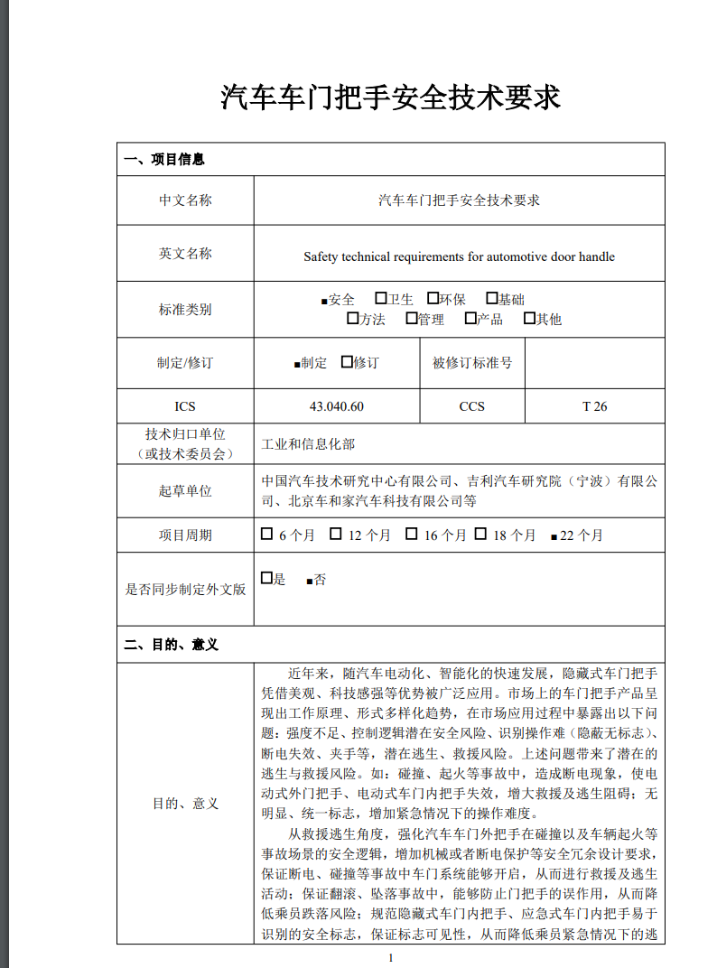 該文件中稱,近年來,隨汽車電動化、智能化的快速發(fā)展,隱藏式車門把手憑借美觀、科技感強等優(yōu)勢被廣泛應用。市場上的車門把手產(chǎn)品呈現(xiàn)出工作原理、形式多樣化趨勢,在市場應用過程中暴露出以下問題:強度不足、控制邏輯潛在安全風險、識別操作難(隱蔽無標志)、斷電失效、夾手等,潛在逃生、救援風險。上述問題帶來了潛在的逃生與救援風險。如:碰撞、起火等事故中,造成斷電現(xiàn)象,使電動式外門把手、電動式車門內(nèi)把手失效,增大救援及逃生阻礙;無明顯、統(tǒng)一標志,增加緊急情況下的操作難度。