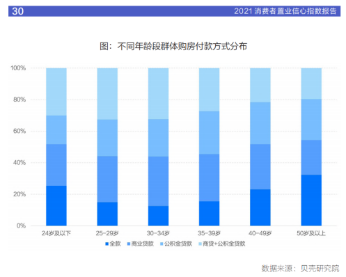 《報告》還顯示,消費客群普遍通過加杠桿方式購房,受調群體中全款購房比例僅占 18.1%。對比不同年齡段群體看,25-39歲群體對杠桿的依賴度較高,貸款購房比例超過8成,其中30-34年齡段群體貸款比例最高,達87.4%。80前群體資金積累相較充足,對杠桿的依賴度相對較低,貸款比例未超過8成。95后父母多為60、70后,而這兩代人已經有一定的財富積累,在購置房產時,有能力對子女進行資助,因此購房群體中全款購房比例相對較高。從購房群體的需求類型看,首次置業(yè)群體購房杠桿較高,貸款比例達86.6%。