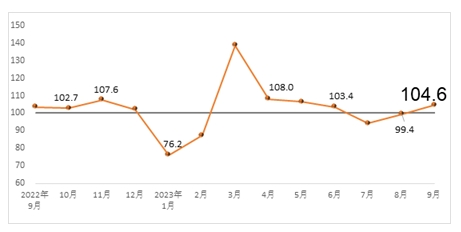 據(jù)中國建筑材料聯(lián)合會發(fā)布的數(shù)據(jù)顯示,2023年9月份建筑材料工業(yè)景氣指數(shù)為104.6點(diǎn),較上月回升5.2點(diǎn),高于臨界點(diǎn),處于景氣區(qū)間,建筑材料工業(yè)運(yùn)行有所恢復(fù)。