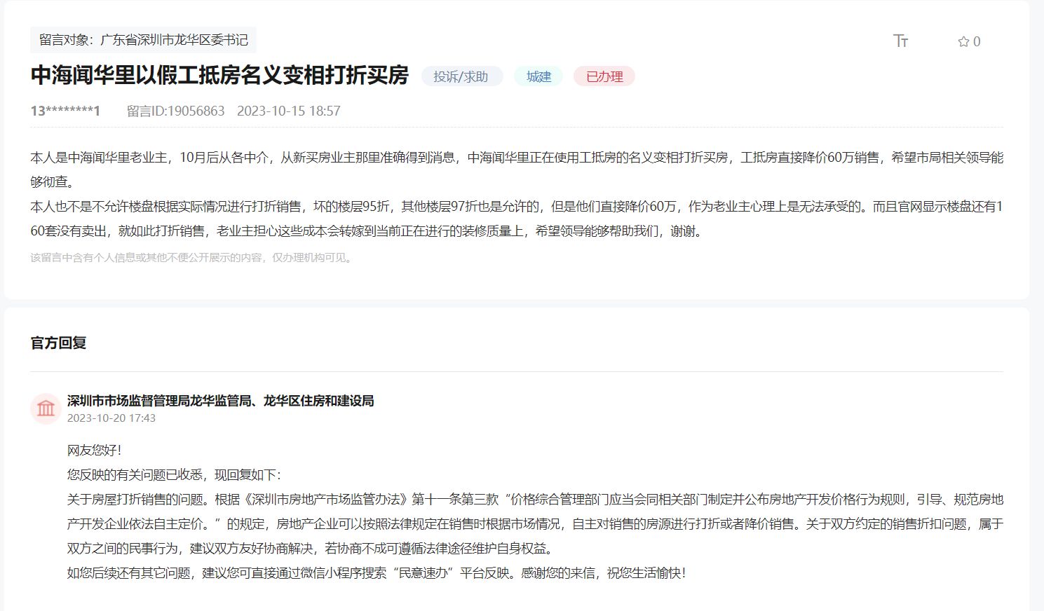 稍早的10月15日,一名自稱(chēng)深圳市龍華區(qū)中海聞華里老業(yè)主在領(lǐng)導(dǎo)留言板留言稱(chēng),該樓盤(pán)以假工抵房名義變相打折買(mǎi)房。