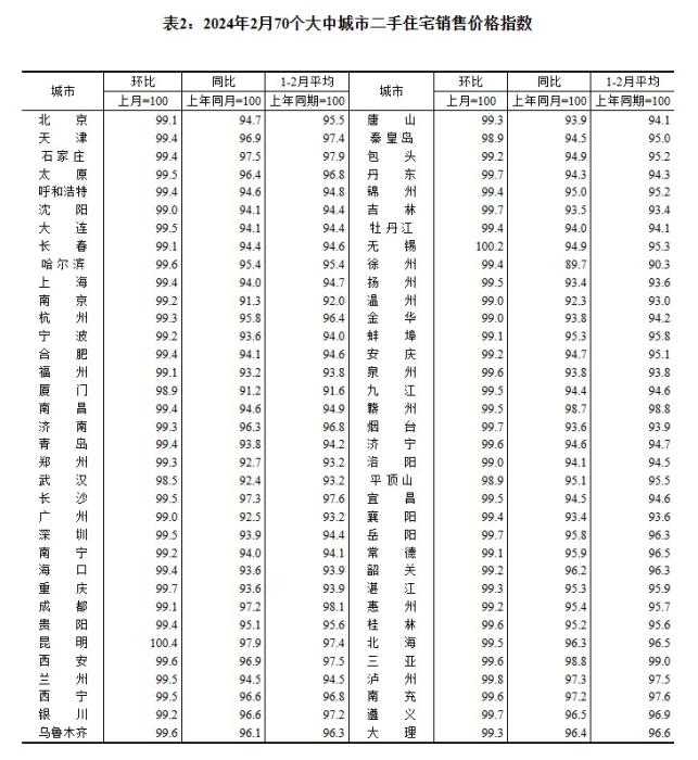 2024年2月70個大中城市二手住宅銷售價格指數(shù)。 截圖自國家統(tǒng)計局官網(wǎng)