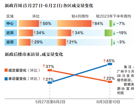 廣州“5·28”新政后,市場反應確實很積極。據(jù)合富研究院監(jiān)測,“5·28”新政落地,連續(xù)政策利好刺激下全市成交(基于認購數(shù)據(jù))階梯式上漲。5月27日至6月2日,來訪、成交環(huán)比分別上升21%、37%。各區(qū)域成交熱度均有改善,中心區(qū)域成交環(huán)比上升50%,多個熱盤如天河區(qū)越秀·觀樾,海珠區(qū)保利燕語堂悅、琶洲南TOD,荔灣區(qū)保利和頌等單周成交超20套。近郊、遠郊成交環(huán)比分別上升34%及29%。此外,6月3日至10日,廣州樓市熱度持續(xù)活躍,來訪量比前一周上漲45%,成交量(基于認購規(guī)模統(tǒng)計)環(huán)比上升22%;近郊黃埔、番禺來訪人氣環(huán)比均有不同程度上升,成交量比前一周上漲27%。
