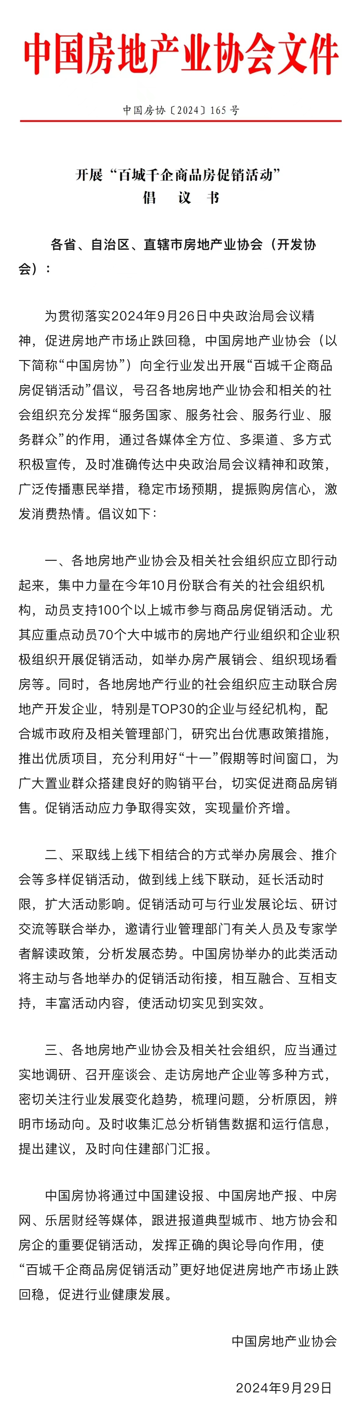 央廣網(wǎng)北京10月11日消息(記者安垚)據(jù)中國房地產(chǎn)業(yè)協(xié)會(huì)微信公眾號(hào)消息,為貫徹落實(shí)9月26日中央政治局會(huì)議精神,促進(jìn)房地產(chǎn)市場止跌回穩(wěn),在住房和城鄉(xiāng)建設(shè)部的指導(dǎo)下,9月29日,中國房地產(chǎn)業(yè)協(xié)會(huì)(以下簡稱“中國房協(xié)”)發(fā)出開展“百城千企商品房促銷活動(dòng)”倡議。