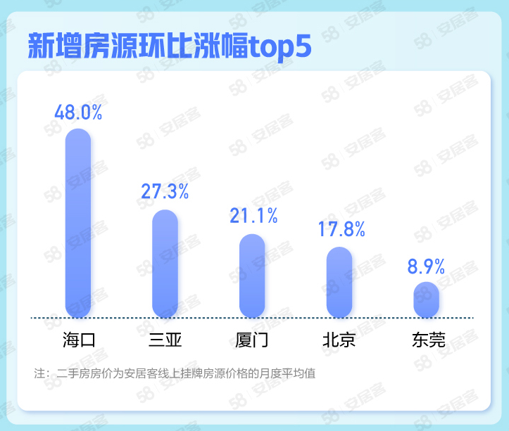 在新增供應方面,10月全國65城新增掛牌房源量環(huán)比下跌4.1%。全國新增掛牌量房源環(huán)比上漲的前三名城市分別是??凇⑷齺?、廈門,分別上漲48%、27.3%、21.1%。