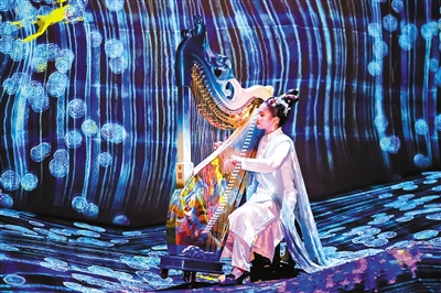 以往的音樂會中,觀眾是在固定位置坐著聽,而在沉浸音樂會《只此一夢》上,現(xiàn)場的觀眾跟隨著指引不斷行進(jìn),從而開啟了一種新的聽音樂和逛展覽的模式。例如,《無窮無盡的水晶宇宙》本來就是北京teamLab無相藝術(shù)空間的網(wǎng)紅打卡點,如水晶雨滴一般的視覺呈現(xiàn),配合琵琶叮咚如玉珠散落水晶盤中,竹笛聲悠揚似鷓鴣穿飛瓊林苑里,正是玉樹瓊枝點點鳥,珠花盛開鷓鴣飛!《只此一夢》沉浸音樂會是可以聽的畫面,是可以看的音符,觀眾與樂手可謂“零距離”。