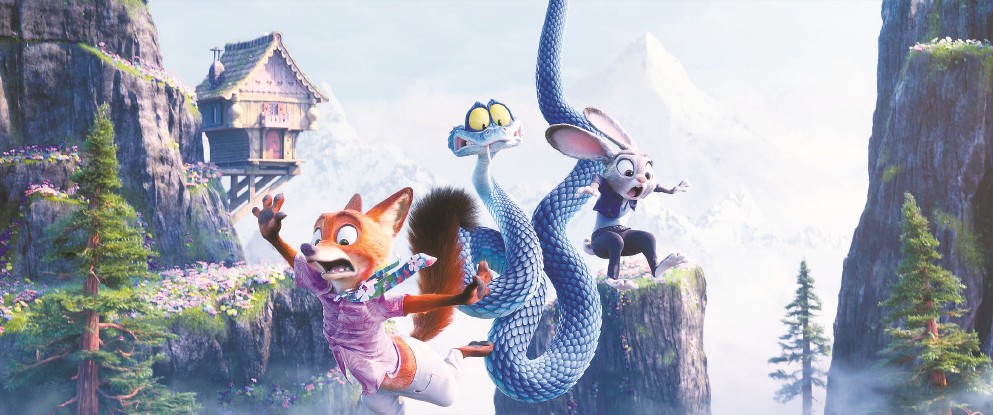 不過《瘋狂動物城2》的“奔跑”意涵并不會上升到《羅拉快跑》的哲思層面。動物們的一路狂奔自然也是為了成就影片的“好看”。從冰山雪川到熱帶雨林,從沙漠風生到沼澤水起,汽車追逐要的是光怪陸離的街景,水里逃生要的是窒息壓迫的氛圍,冰雪對決要的是蒼茫一片的天地。觀眾們的視線跟隨著動物角色的行動高速地移轉(zhuǎn),從一個驚奇進入下一個驚奇,從一處景觀轉(zhuǎn)入下一個景觀,這種步移景換的觀看,與他們在迪士尼游樂園里進行沉浸式大型項目的體驗非常相似。只不過,目迷五色的“眩暈”體驗從5分鐘延長到了100分鐘。未來的一個市場可能大概是,人們會有機會在某處的迪士尼樂園項目中重溫熟悉而親切的瘋狂動物城記憶。