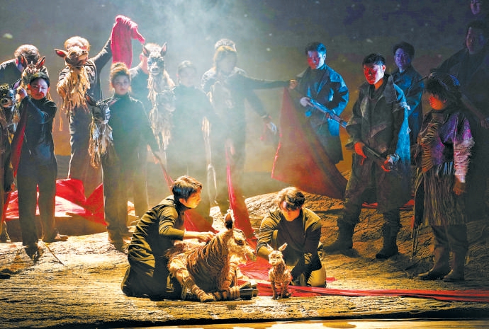 在舞臺(tái)呈現(xiàn)上,舞美設(shè)計(jì)常煒以“山的血脈”為核心意象,山體內(nèi)部的紋理宛若血液流動(dòng),山石土地俱在跳動(dòng)、呼吸。整體來說,《可可西里》的舞臺(tái)置景變化并不劇烈,燈光、景片以及經(jīng)幡等裝飾以恰到好處的力度表明時(shí)間地點(diǎn)的轉(zhuǎn)換,暗喻劇情和人物內(nèi)心的走向——在有些舞臺(tái)作品選擇以噱頭和炫技招攬觀眾的當(dāng)下,《可可西里》流淌著一種久違的、質(zhì)樸的暖意,主創(chuàng)團(tuán)隊(duì)為這部作品付出了足夠的誠(chéng)意,比如,無論是電影《可可西里》,還是人們對(duì)這片凈土的既有認(rèn)知,動(dòng)物都在其中扮演重要的角色,但毫無疑問,要在舞臺(tái)上把動(dòng)物塑造得真實(shí)且有藝術(shù)表現(xiàn)力,并不容易。主創(chuàng)團(tuán)隊(duì)沒有偷工減料地繞過這個(gè)難題,而是以模仿動(dòng)物習(xí)性的“偶”代替,當(dāng)從“母羊”的腹中剖開一卷鮮紅的長(zhǎng)綢,“小羊”跌跌撞撞地學(xué)著起身時(shí),溫柔灑落的天光配合層層遞進(jìn)的音樂,把現(xiàn)場(chǎng)氣氛推向一次動(dòng)人的高潮。