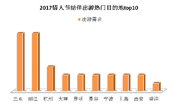 情人節(jié)當(dāng)天在線結(jié)伴出游者的目的地選擇既有國內(nèi)的也有國外的,比較熱門的目的地主要有:三亞、麗江、杭州、大理、昆明、曼谷、寧波、上海、西安、香港。