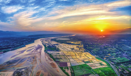 芮城縣境內(nèi)蜿蜒前行的黃河與岸邊碧綠的田野相映成趣。