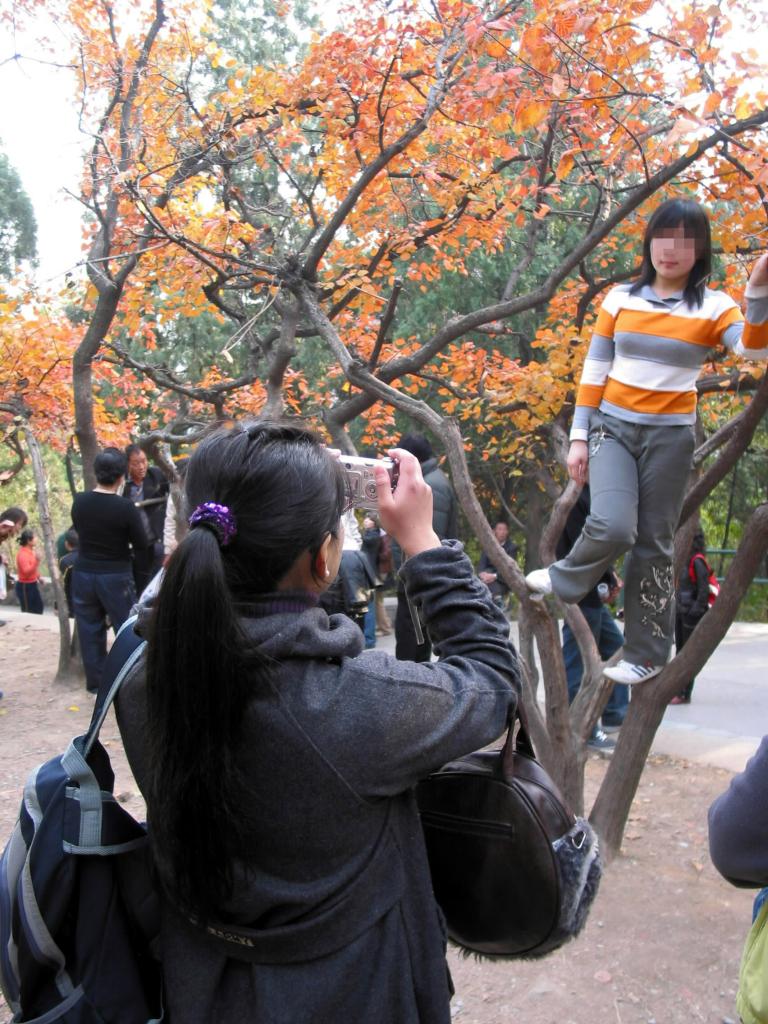 2007年11月4日,不少游客來到北京香山觀賞紅葉,一名游客爬上樹與紅葉合影。新華社記者孫洪磊攝