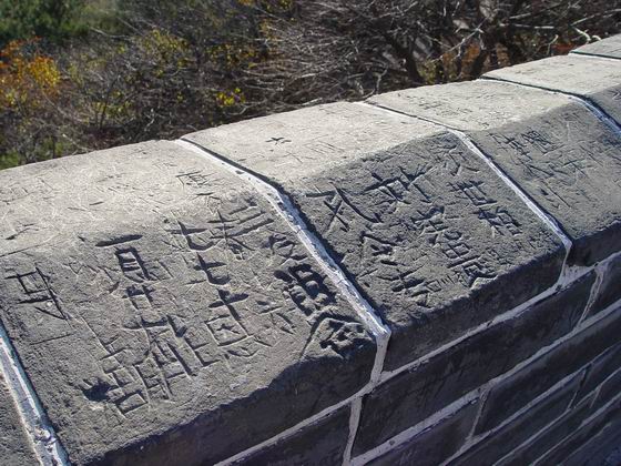 游客在北京八達(dá)嶺長城城墻頂部刻的字(2005年11月攝)。新華社發(fā)(鄭嚴(yán)攝)