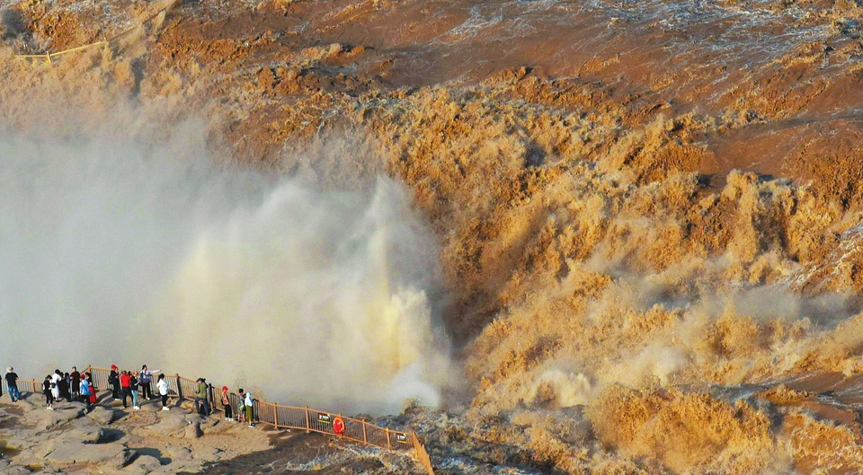 7月10日,游客在吉縣黃河壺口瀑布景區(qū)游覽觀瀑。近日,受上游降雨增多和萬(wàn)家寨水庫(kù)調(diào)節(jié)放水影響,黃河干流迎來(lái)汛期,滾滾波濤奔騰而下,氣勢(shì)極為壯觀,吸引了眾多游客前來(lái)參觀。